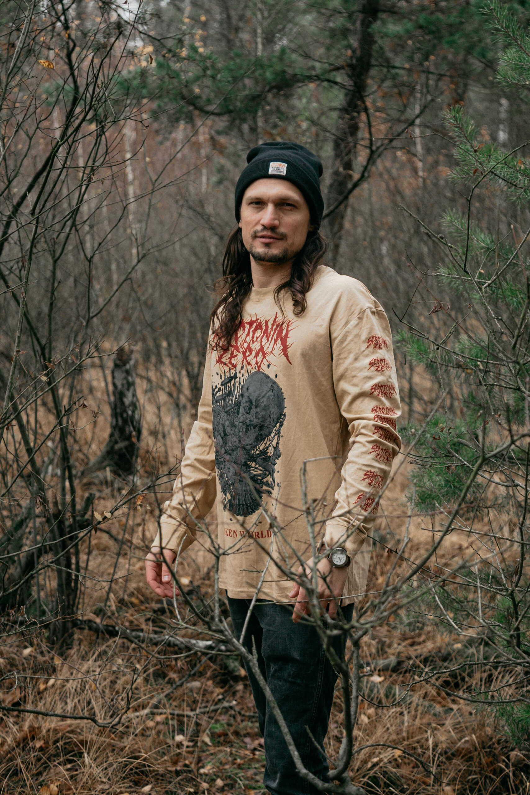 Bieżowy longsleeve z kolorowym nadrukiem, z logo i nazwa płyty na rękawach