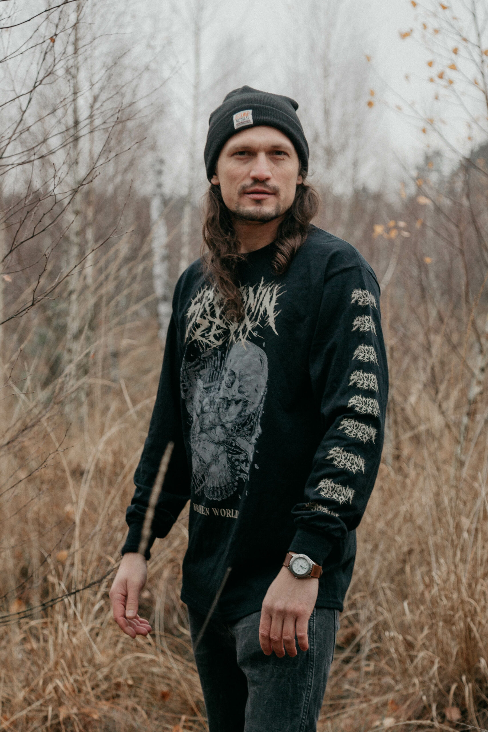 Czarny longsleeve z kolorowym nadrukiem, z logo i nazwa płyty na rękawach